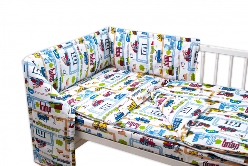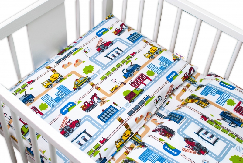 Baby Nellys 3-dílná sada Mantinel s povlečením – Stavební stroje, bílá, 135 x 100