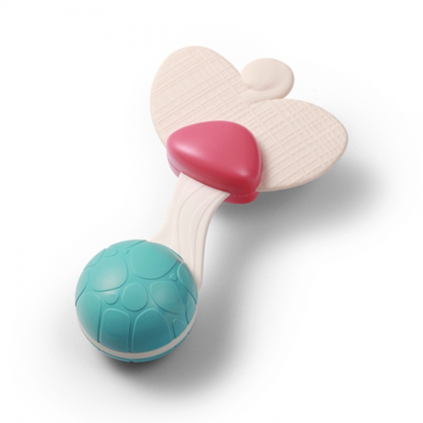 Ergonomický design: Kousátko-chrastítko je navrženo tak, aby dokonale padlo do malých dětských ručiček, což usnadňuje jeho držení a manipulaci.
