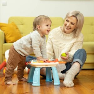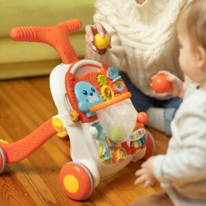 Vzdělávací hračka z řady TOYZ Activity, ideální pro dítě, které již začalo dělat první krůčky. Díky kombinaci několika možností v jedné hračce zabaví vaše batole na mnoho hodin. Dá se použít jako odstrkovadlo nebo interaktivní stůl se spoustou atrakcí. Čas zpříjemní košík, do kterého může vložit 3 plastové míčky s chrastítkem, bateriové a odnímatelné piano ve tvaru kraba, točící se ozubená kola a mnoho dalších překvapení. Přední panel lze sejmout a proměnit v hrací stolek.