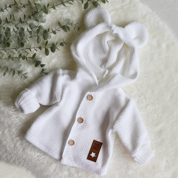 Elegantní bílý kojenecký svetřík s moderní kapucí s ušima.