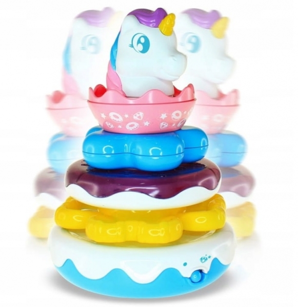 Bavte se s jednorožcem stavěním pyramidy z barevných kroužků a poslechem veselé melodie!