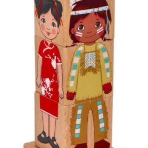Zde je stojící hračka se třemi krychlovými bloky na kůlu. Bloky lze libovolně otáčet a vytvořit tak čtyři postavy představující děti žijící v různých oblastech světa.