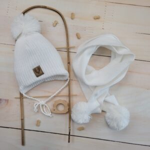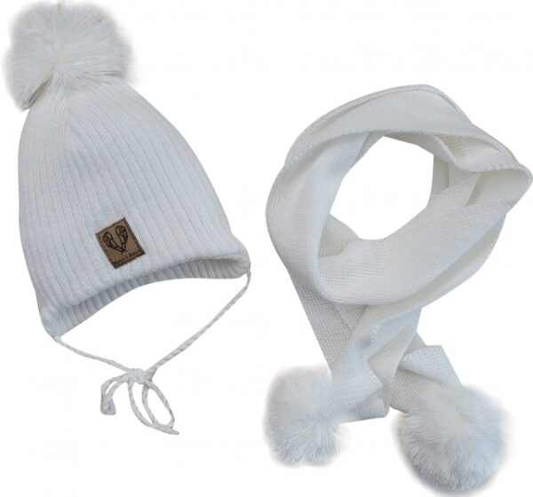 Dvouvrstvá zimní pletená čepička na zavazování + šál s bambulky.