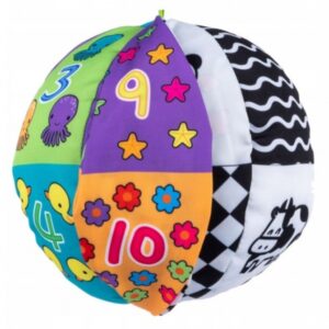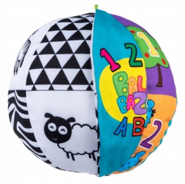 Oboustranný míček je oblíbená hračka. Balónek roste s dítětem! Když je mladší, můžeme jej otočit na černobílou stranu. Kontrastní barvy stimulují zrak dítěte a čísla umístěná na stěnách pomohou spojit zábavu s učením. Až dítě povyroste, můžeme ho otočit na druhou, barevnou stranu. Najdeme zde spoustu obrázků zobrazujících čísla s odpovídajícím počtem prvků. Při házení se ozve příjemný zvuk zvonků.
