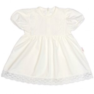 Bavlněné šatičky v jemně smetanové barvě s jemným krajkovým zdobením a krátkým rukávem.