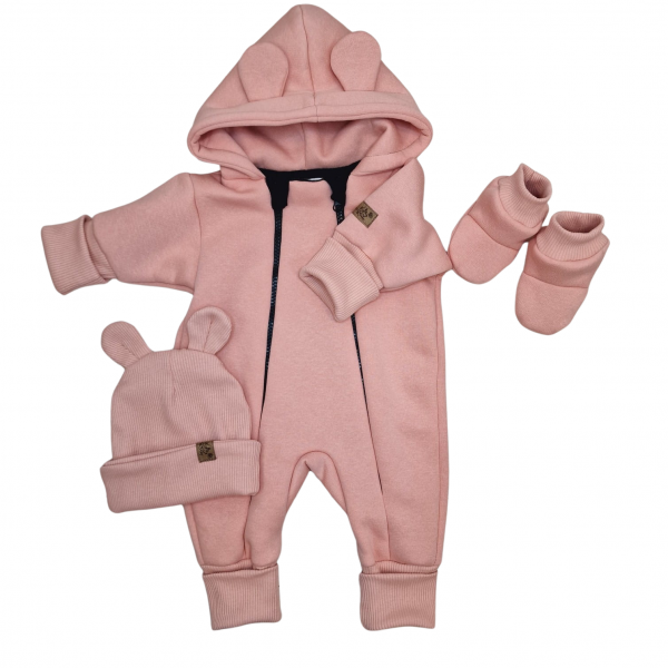 Zateplený overal s kapucí + žebrovaná dvouvrstvá čepice.