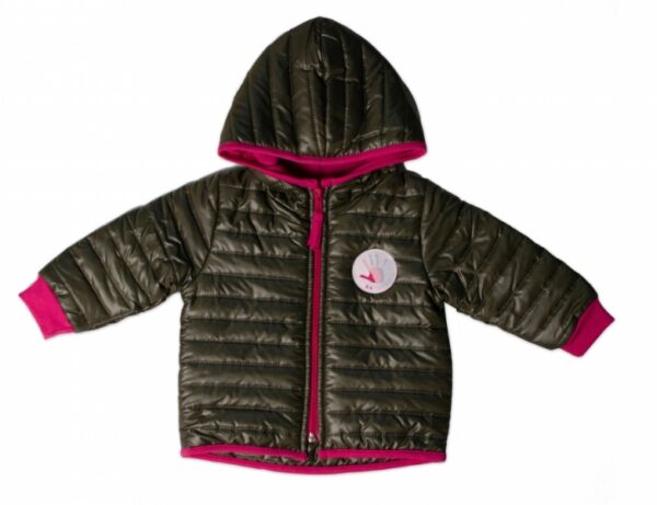 Přechodová prošívaná bunda s kapucí – olivová/růžová, vel. 86