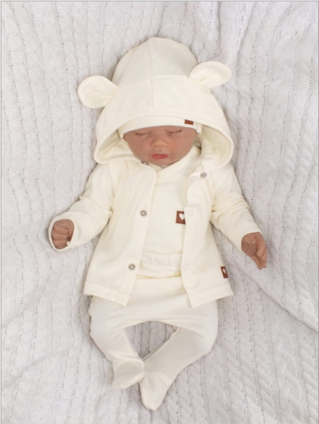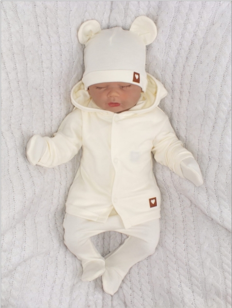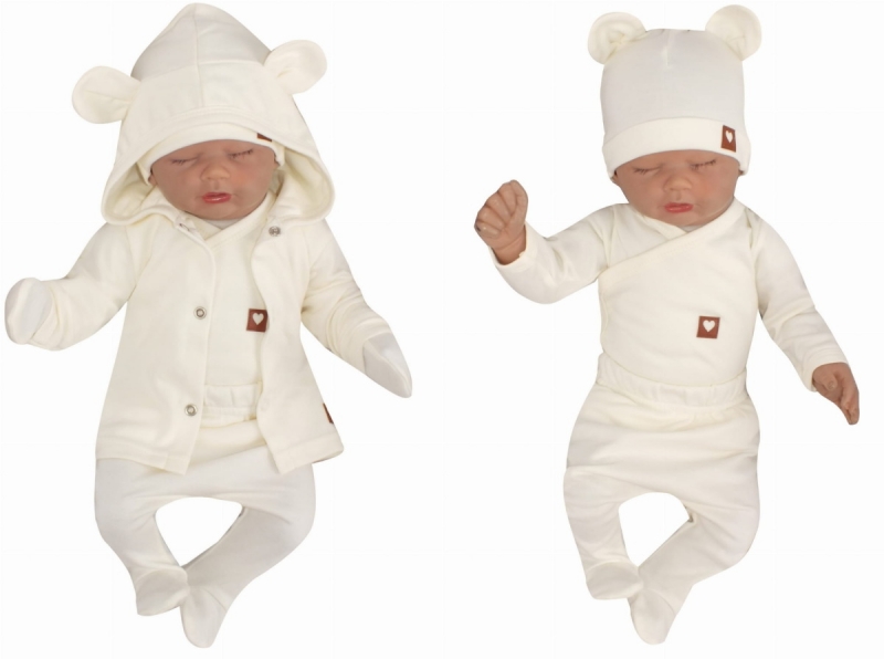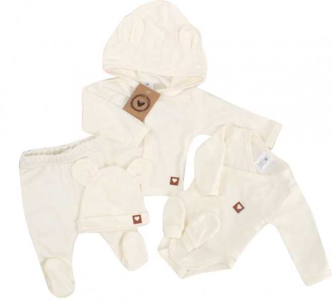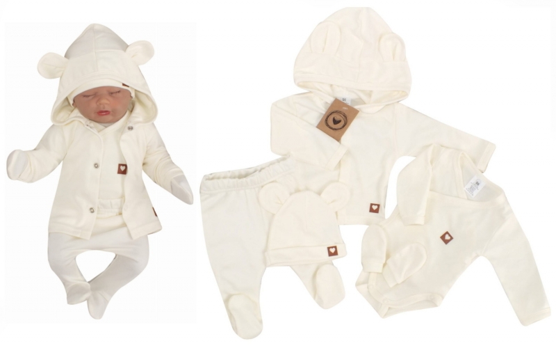 Sada do porodnice 5D, body, polodupačky, kabátek, čepička, rukavičky – ecru, vel. 56