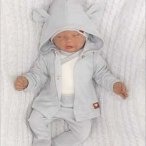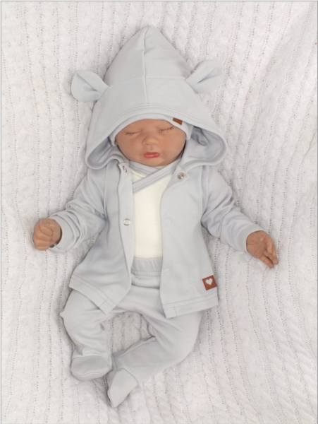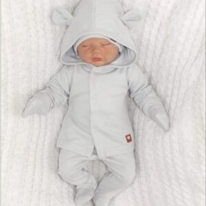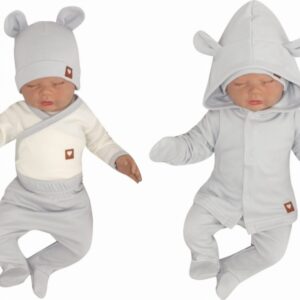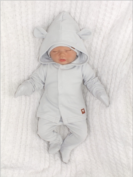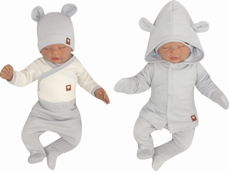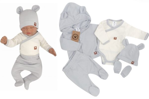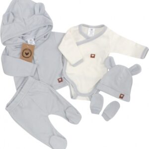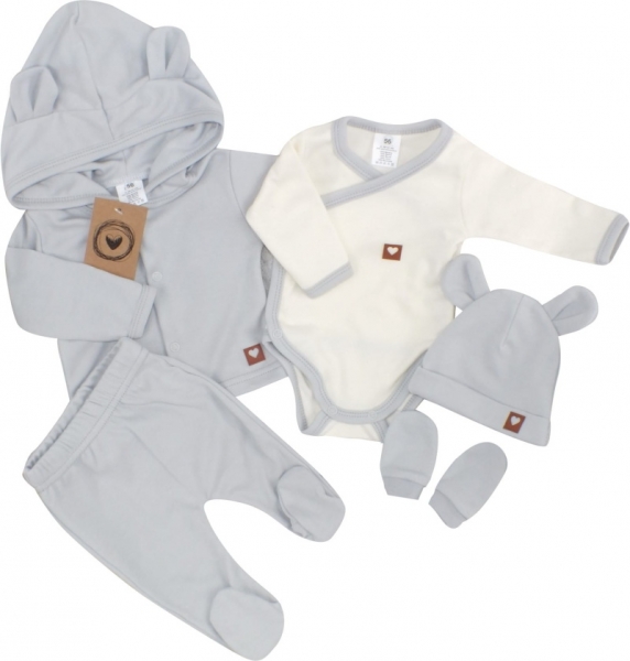 Sada do porodnice 5D, body, polodupačky, kabátek, čepička, rukavičky – šedá, vel. 56