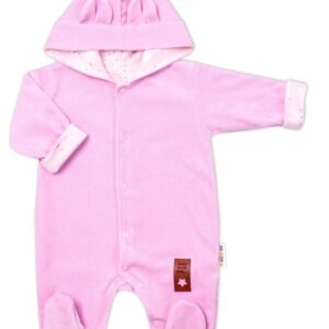 Dvouvrstvý teplejší velurový overálek podšitý bavlněnou látkou se stylovou kapucí ozdobenou ušima. Celorozpínací na cvočky, což umožňuje snadné převlékaní a přebalovaní.