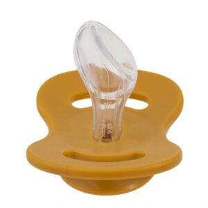 Silikon je průhledný syntetický materiál, který je bez zápachu a chuti. Velikost štítu byla přizpůsobena obličeji dítěte a motýlkový tvar ponechává dostatek místa pro nos, čímž je dosaženo nejlepšího možného přizpůsobení.