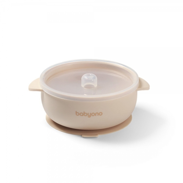 Silikonová dětská miska s přísavkou a víčkem BabyOno – ideální pro zavádění příkrmů.