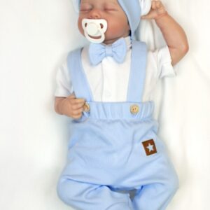 Tato bavlněná souprava je určena pro malé gentlemeny, kteří milují šarm a eleganci. Obsahuje celorozpínací body s krátkým rukávem a nádherným motýlkem, který není odnímatelný, polodupačky s láclem z žebrovaného bavlněného materiálu a roztomilým baretem, která dodává celému outfitu šmrnc.