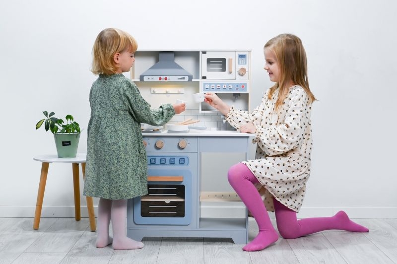 Všechny dveře se zavírají na magnety. Kuchyně byla propracována v každém detailu. Po stranách jsou také dvě madla pro snadnější přenášení. Krásné bílé, modré a šedé barvy jsou také módní kombinací, která se hodí do mnoha dětských pokojíčků.