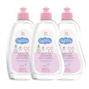 Dětské lahvičky, hračky a doplňky umyjte v roztoku 2-3 ml Bebble lahvičky, hračky a prostředku na mytí nádobí v 1 litru teplé vody. Silně znečištěné nádobí nebo předměty se zaschlým jídlem nebo zbytky mléka lze do takového roztoku nejprve namočit. Po umytí vše důkladně opláchněte čistou vodou.