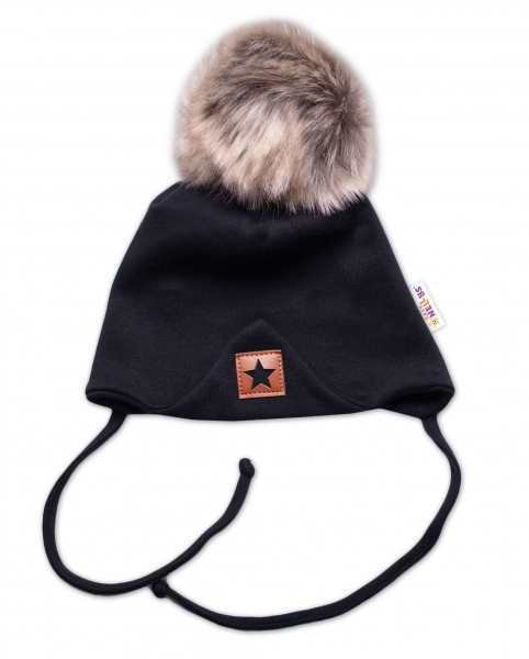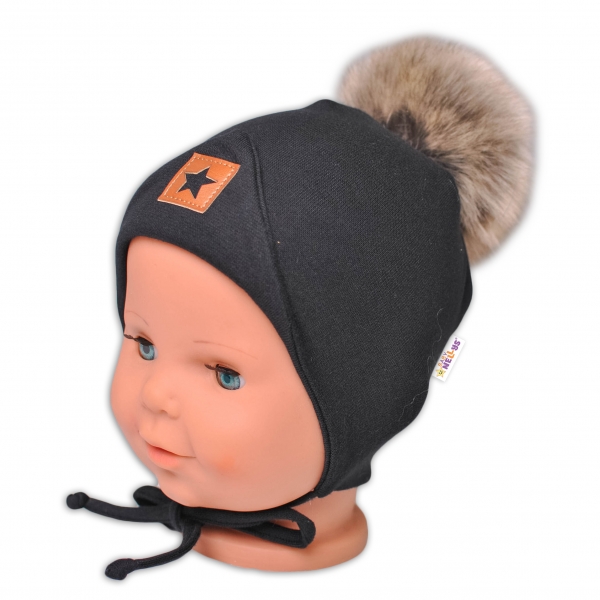 Zimní,podzimní bavlněná dvouvrstvá čepice s bambulí na zavazování Star, černá, vel. 68/80