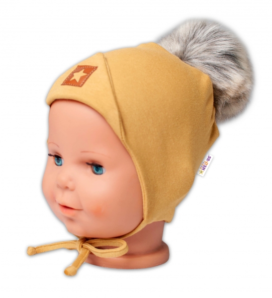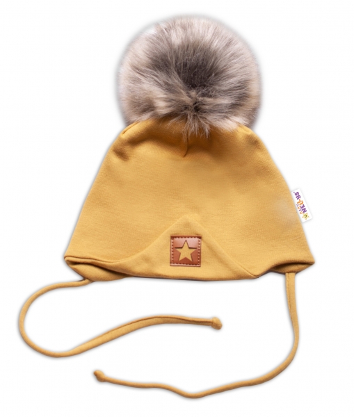 Zimní,podzimní bavlněná dvouvrstvá čepice s bambulí na zavazování Star, hořčicová
