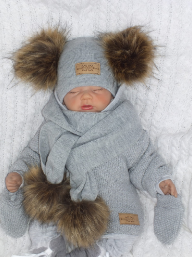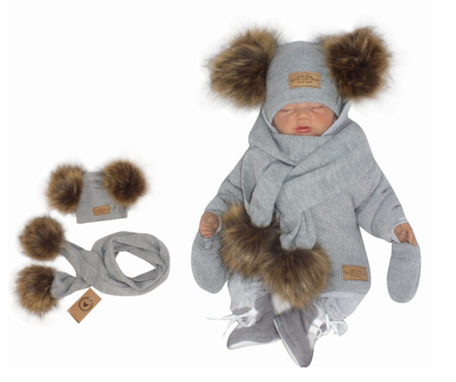 Z&Z Zimní čepice s bambulemi z kožešinky a šálou 2V1, šedá, vel. 86